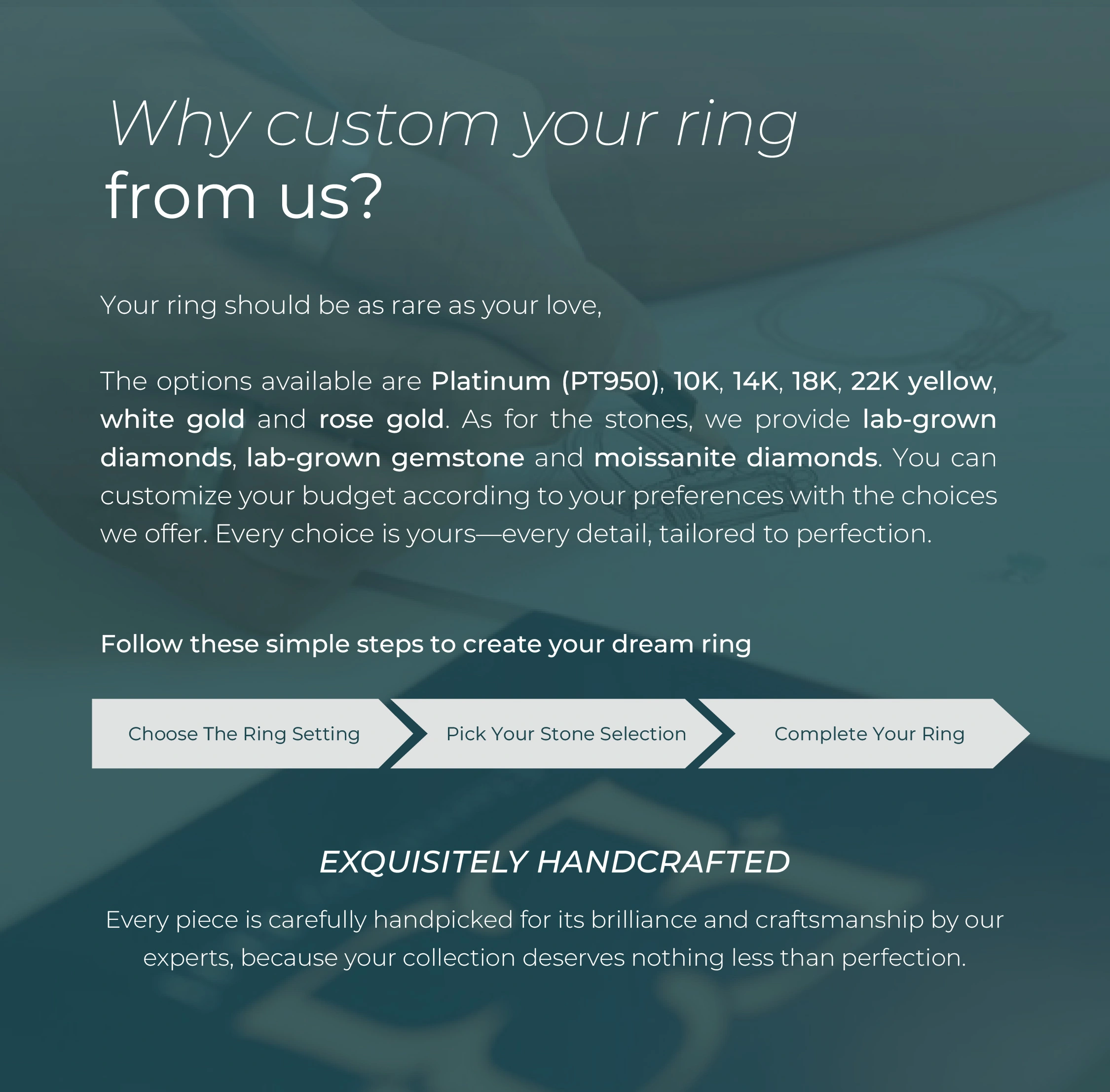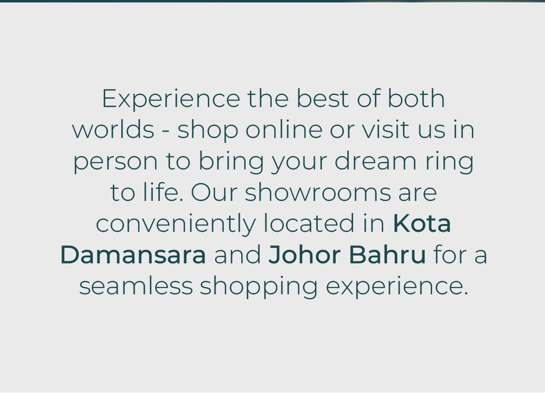 Experience the best of both worlds – shop online or visit us in person to bring your dream ring to life. Our showrooms are conveniently located in Kota Damansara and Johor Bahru for a seamless shopping experience.